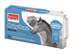 Rockies Baby Pure Salt Licks zapewnia, że konie i kucyki otrzymują naturalną postać niezbędnego sodu, aby utrzymać równowagę płynów w organizmie i zapobiec niedoborowi elektrolitów. Ich stosowanie jest ważne przez cały rok, ale szczególnie w czasie upałów lub po wysiłku. Każdy 2kg blok solny jest wytwarzany pod ciśnieniem przekraczającym 10 000 kg na cal kwadratowy co przez co uzyskuje gęstość i twardość dzięki którym wytrzymuje wszystkie warunki atmosferyczne.